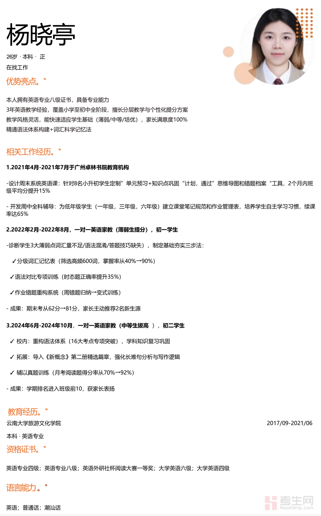专业技能 | 专八 | 语言水平 | 英语;普通话;潮汕话; | |